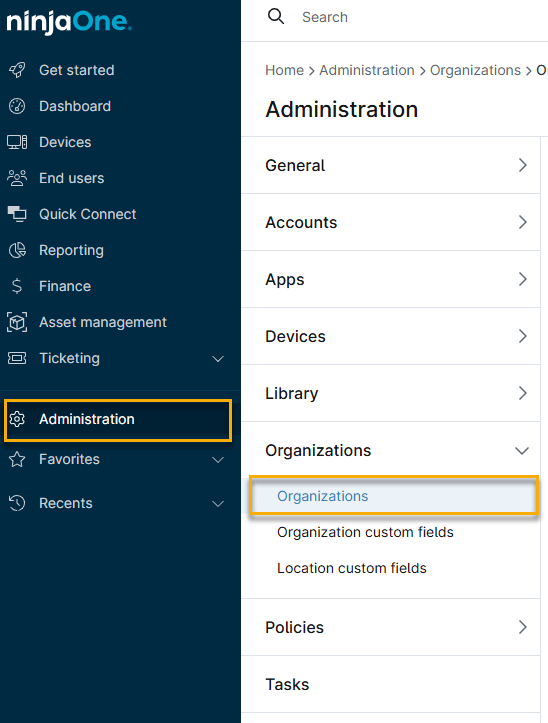 - Click Administration in the navigation menu, then select Organizations from the expanded options.