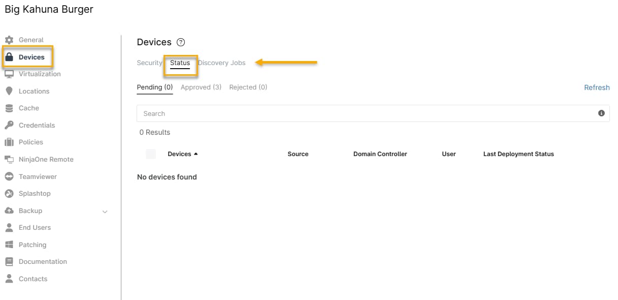 The Device Approval dashboard is an easy way to view and change approval statuses for the pending and rejected devices in your NinjaOne environment.