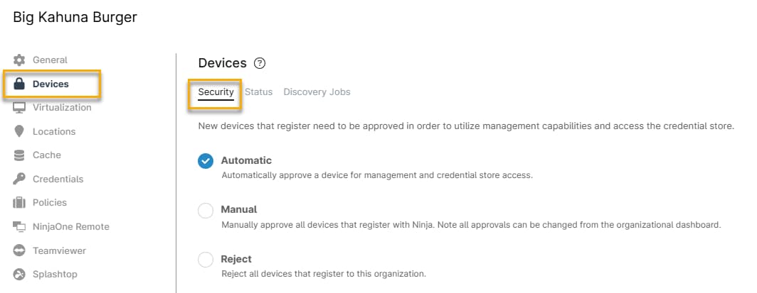 - Manual: A NinjaOne system administrator must manually approve or reject new devices.