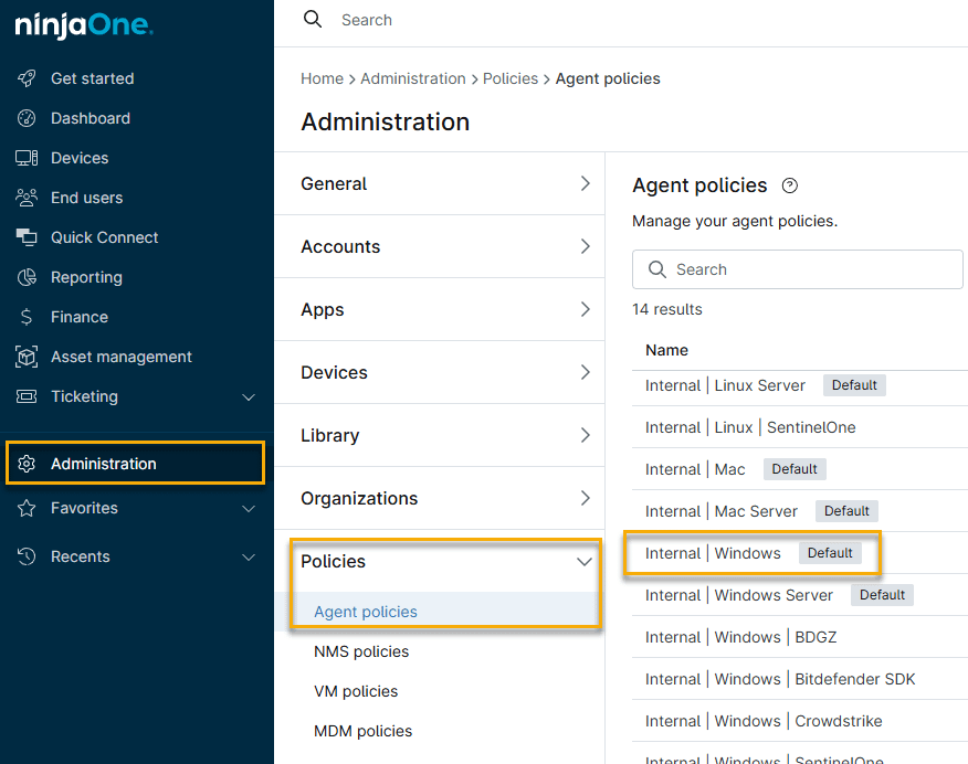 1. In NinjaOne, click Administration → Policies → Agent Polices and select the policy you wish to configure.