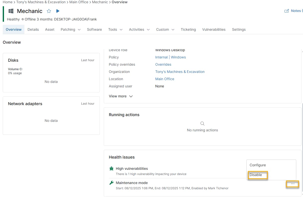 Technicians can now schedule maintenance mode in advance for devices using automations. This feature allows for flexible, recurring maintenance windows that suppress alerts and notifications during planned activities, which is helpful for overnight patching, reboots, or routine Maintenance.