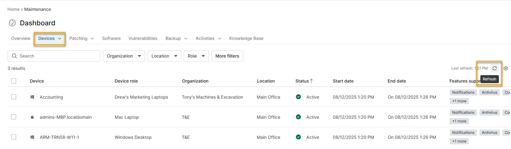 The maintenance dashboard, available at the system and organization levels, lets you view all devices with current or future maintenance windows scheduled.