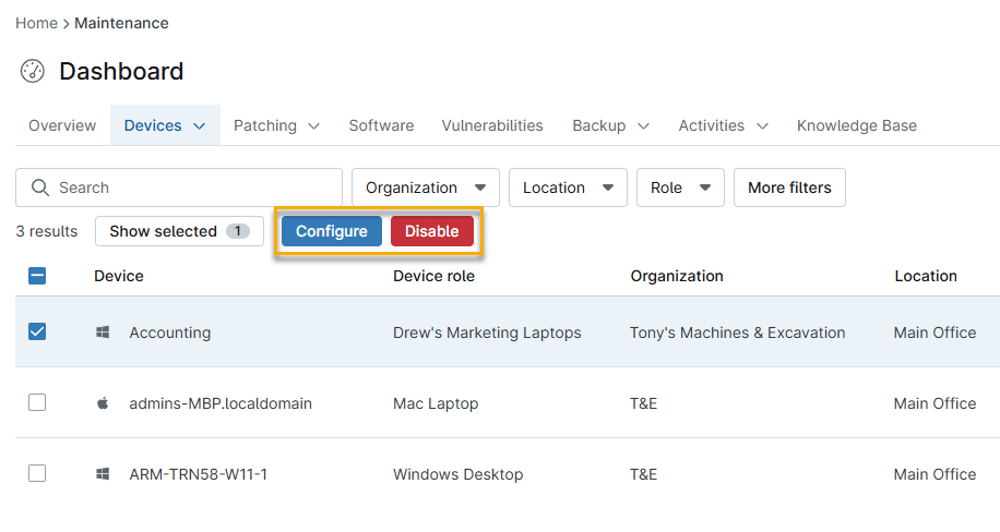 - Select the devices. Additional options to Configure or Disable will appear at the top of the list.
