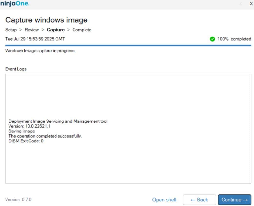 - While the image capture is underway, the log will display steps and the current status. Once complete, the progress bar will reach 100%, with a green check mark.