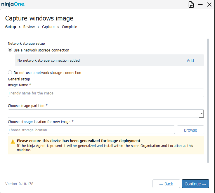 - In Network Storage Setup, select Add and enter the network storage path and credentials used to connect to the network storage (where you previously captured the image during the Image Capture portion of this process). After connecting your network storage, configure the following Deployment Options: