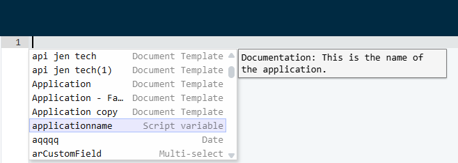 In the script editor, click the editing pane, then press CTRL + Space. The script variable selector displays as a contextual menu. Place your cursor over the variable to view a description. Custom fields also display in this script variable selector.