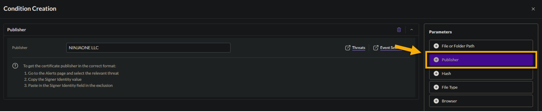 - On the Condition Creation page, click Publisher (also known as "certificate").