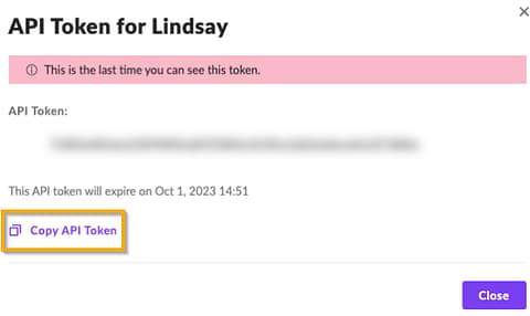 - SentinelOne will generate a new API token and display it in a one-time use window.