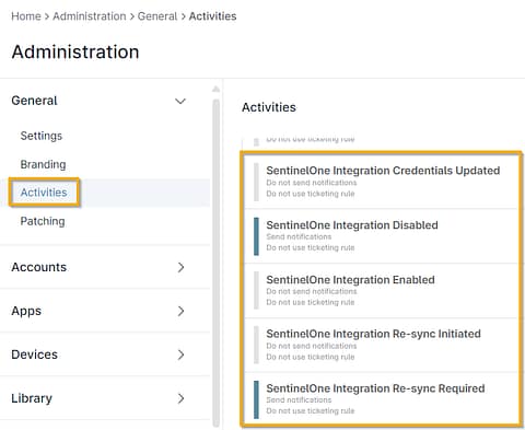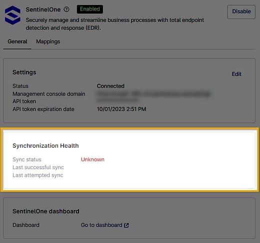 - You can review synchronization health at any time in NinjaOne by navigating to Administration → Apps → Installed → SentinelOne → General.