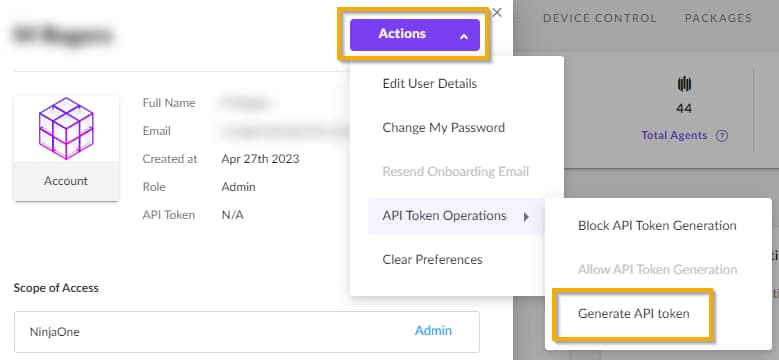 Each NinjaOne user can generate only one token, which remains valid for 30 days. To do so, complete the following workflow.
