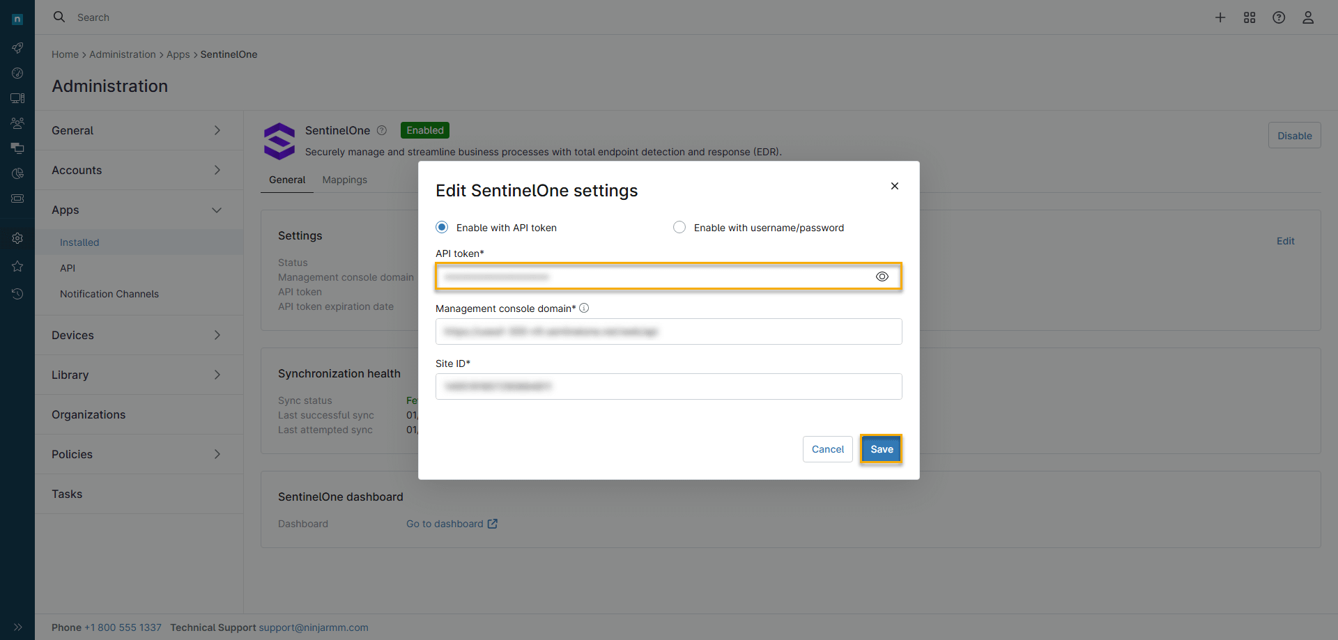 - In NinjaOne, navigate to Administration → Apps → Installed → SentinelOne → General.