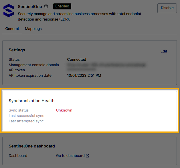 The Synchronization Health section of the SentinelOne app in your NinjaOne instance reports the integration's synchronization status. If the authentication token is invalid, the Sync status field will read Unknown, even if Settings → Status reports Connected.