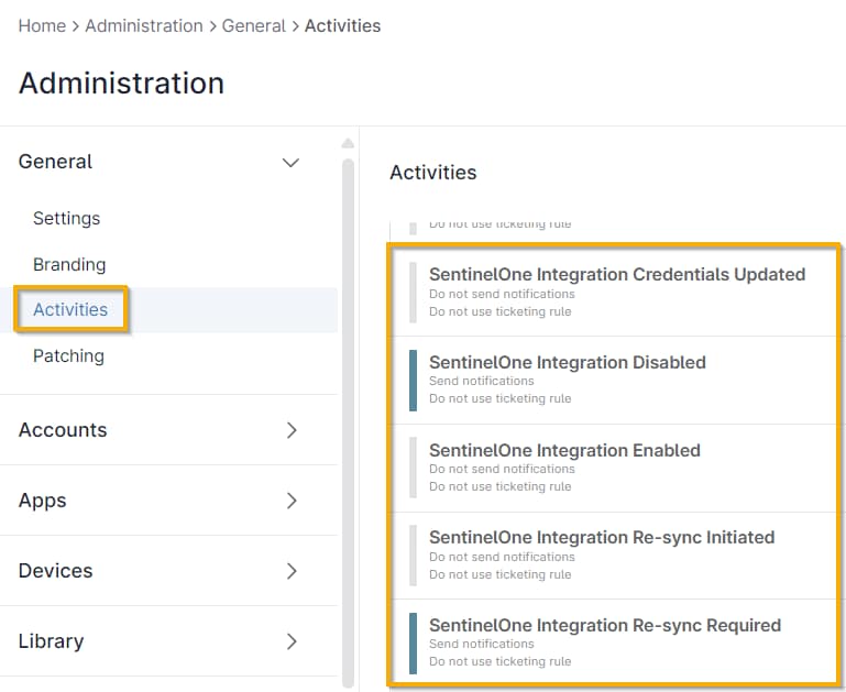 - You can review synchronization health at any time in NinjaOne by navigating to Administration → Apps → Installed → SentinelOne → General.
