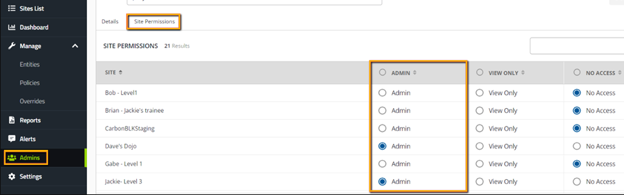 - Click the Admins tab.