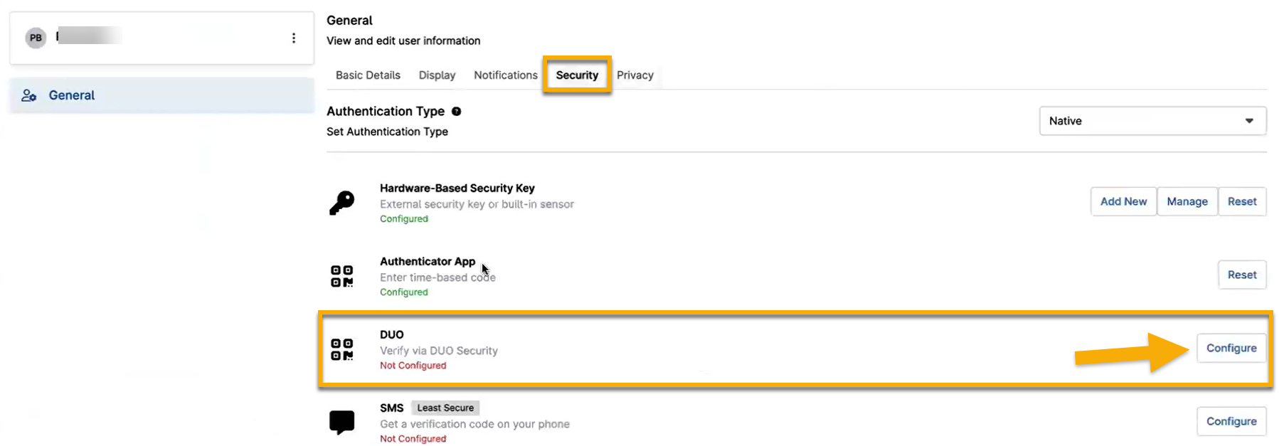 - In NinjaOne, open the end user or technician account. In the General section, open the Security tab.