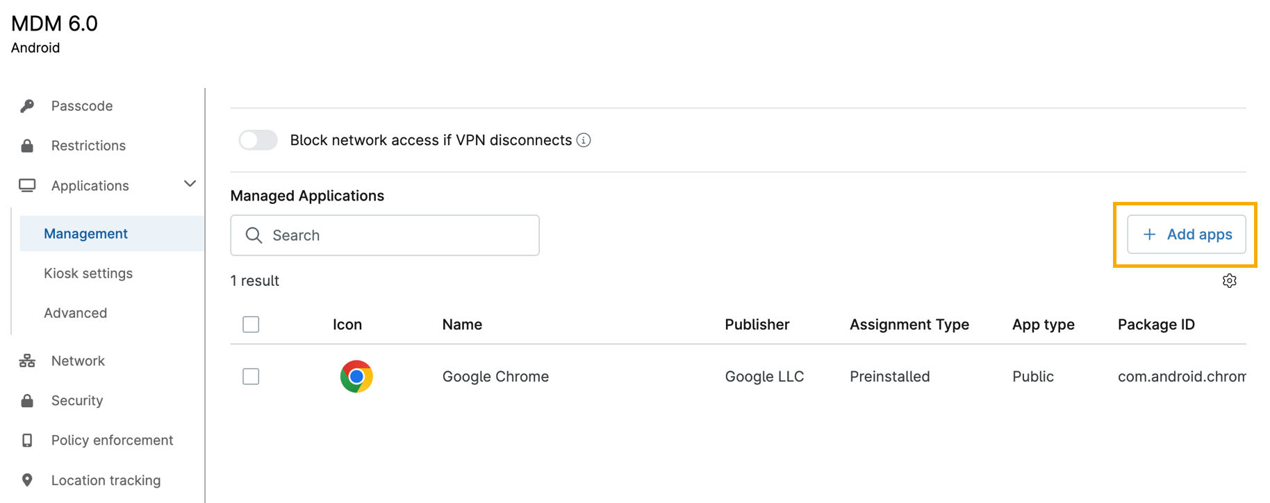 - Scroll down to Managed Applications and click the Add Apps button, then choose Google Play Store from the expanded options.