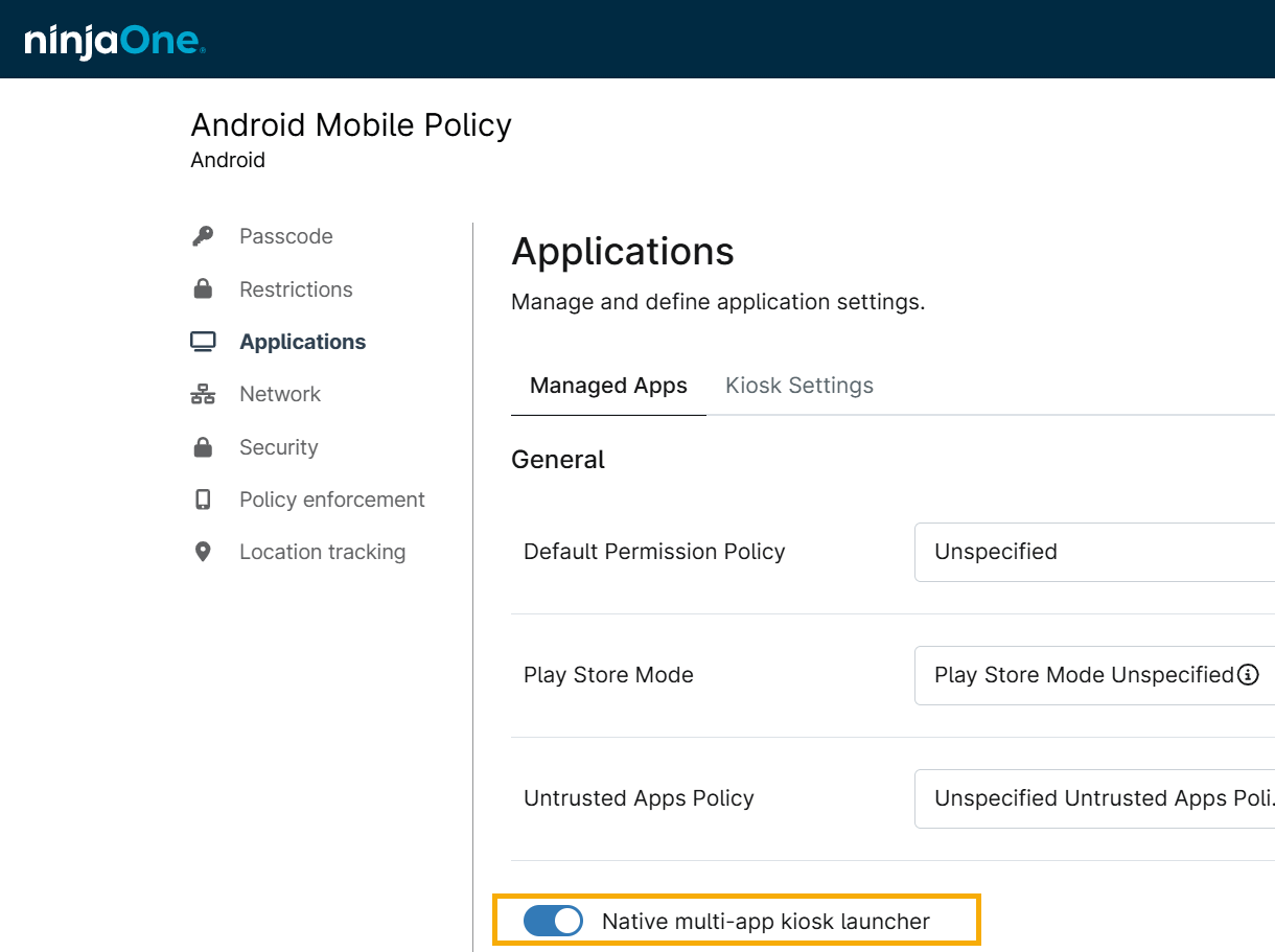In the Android Mobile Policy's Applications page, click the Managed Apps tab and enable the slider for Native multi-app kiosk launcher.