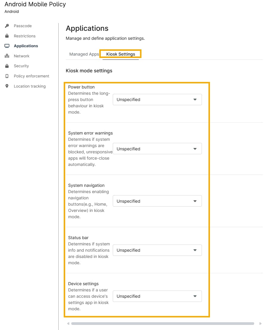 In the Android Mobile Policy's Applications page, click the Kiosk Settings tab, then choose the desired functionality from the drop-down menus under Kiosk mode settings.