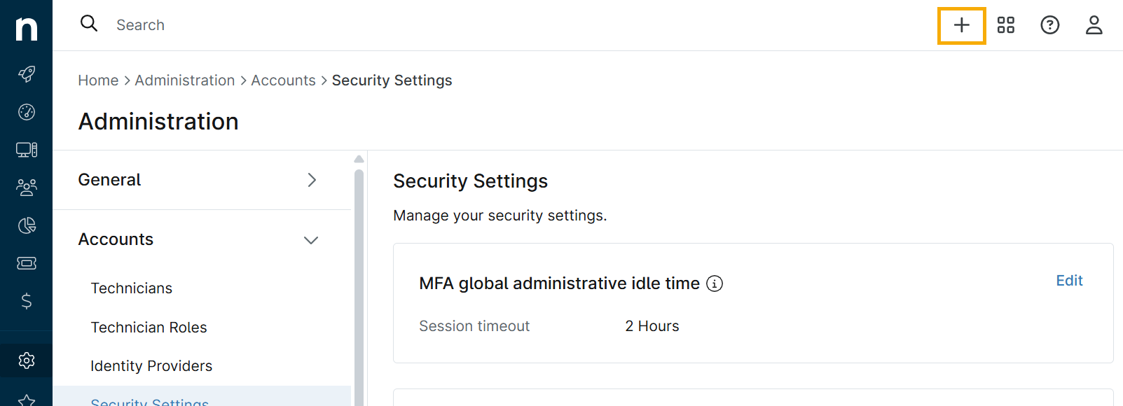 - Navigate to the NinjaOne console and click the plus icon in the top-right corner.