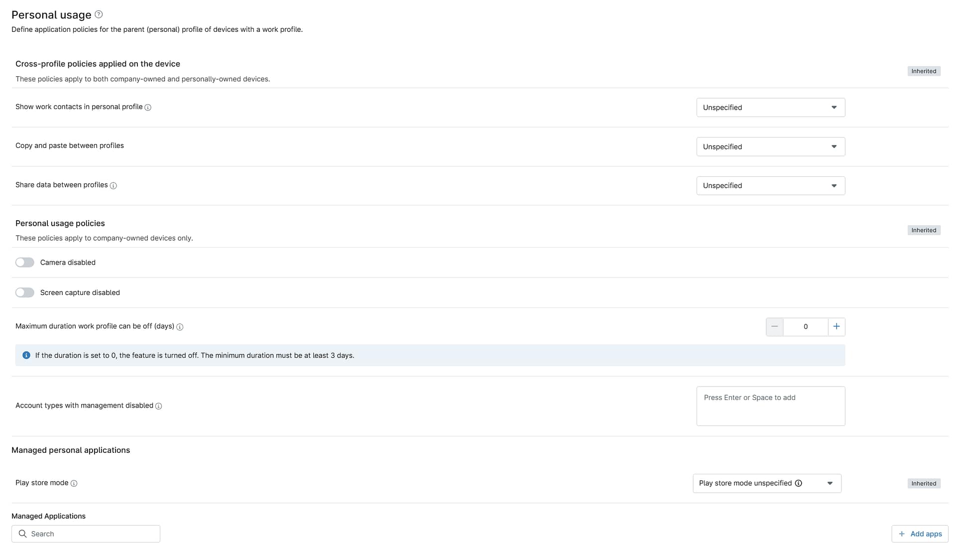 There are three configuration categories: Cross-profile policies applied on the device, Personal usage policies, and Managed applications.