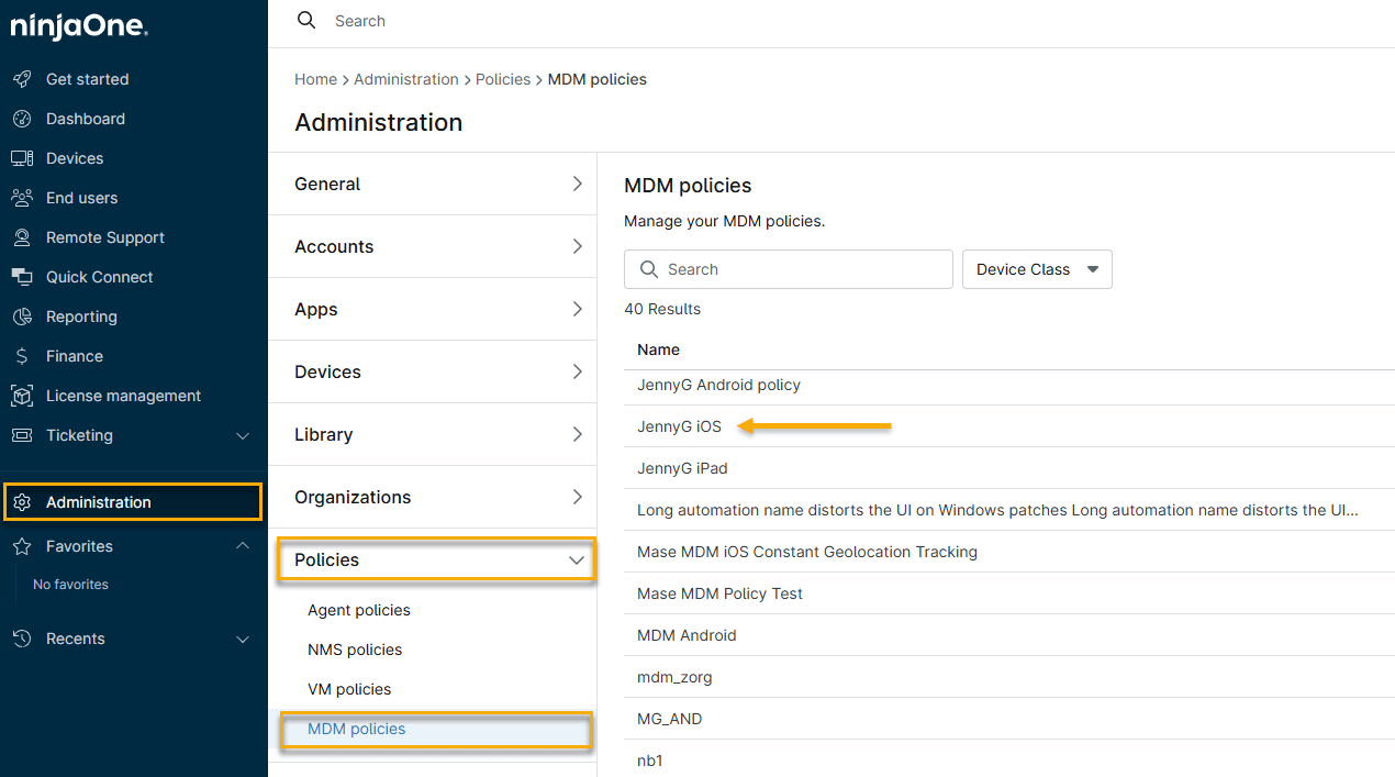 - In NinjaOne, navigate to Administration → Policies → MDM policies, then choose an iOS policy from the Agent policies list.