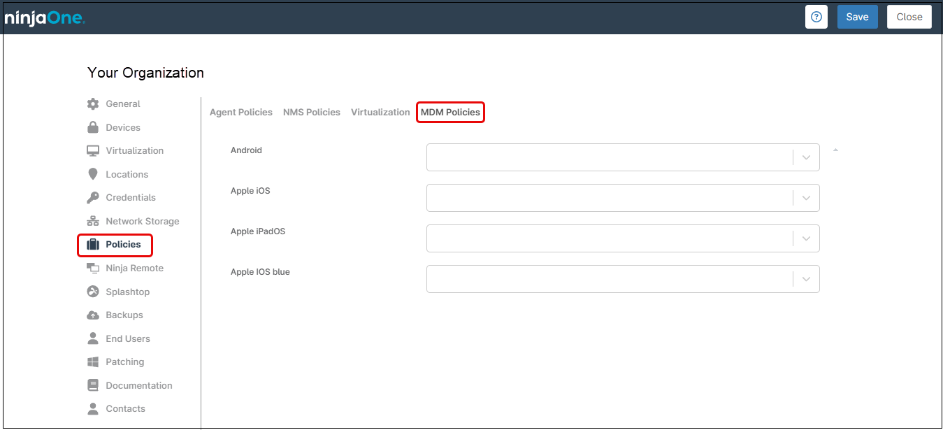 NinjaOne allows default MDM policies to be assigned at the organization level based on device roles. With this method, whenever a device is enrolled in an organization, the appropriate default policy is automatically applied according to its designated role. Follow the steps below to assign default MDM policies at the organization level.