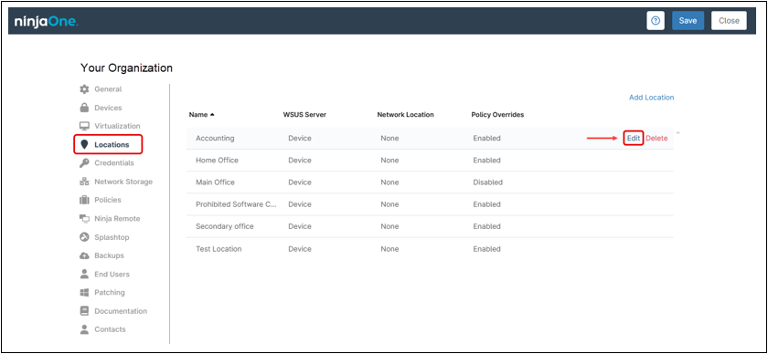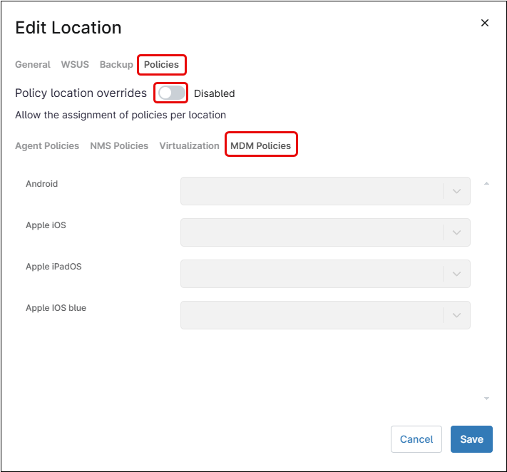 In addition to setting policies at the organization level, NinjaOne allows default MDM policies to be assigned at the location level. This enables different locations within an organization to have their own policies assigned automatically. Location-level policy assignments override those set at the organization level.