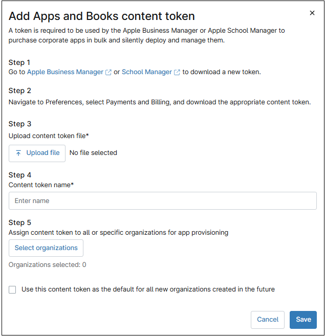 - Click + Add content token. The “Add Apps and Books content token” dialog box appears.