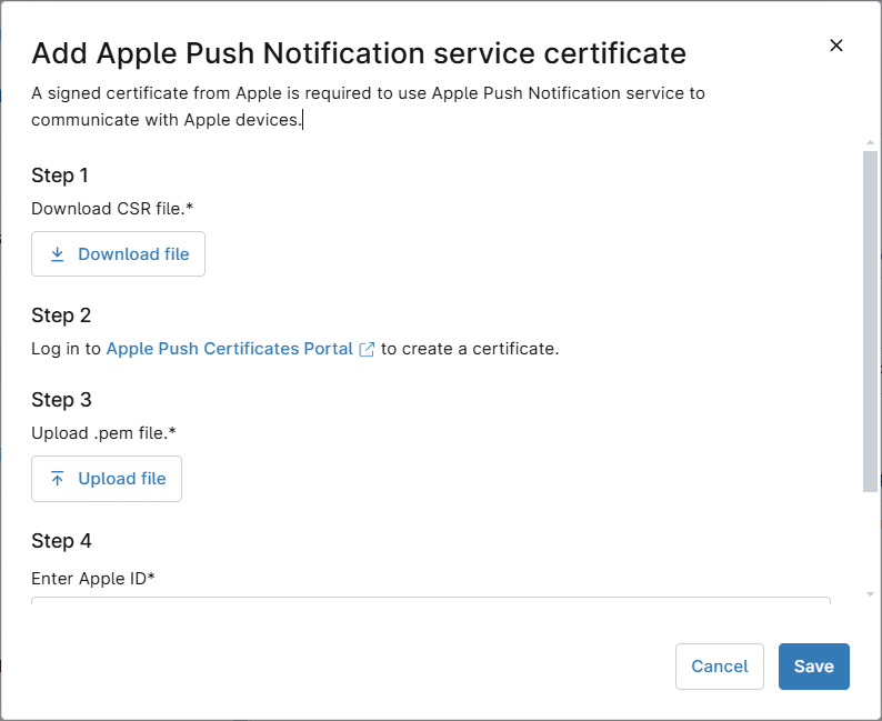 - Click + Add APNs certificate. The Add Apple Push Notification service certificate dialog box appears.