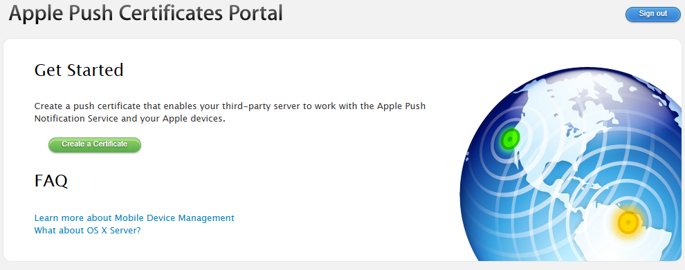 Figure 9. Apple Push Certificate Portal. - Click Create a Certificate. Accept the terms of use.