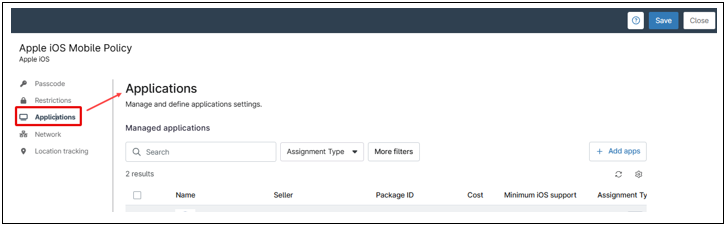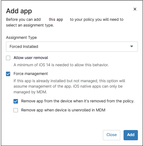 - Select the assignment type from the drop-down (force installed or blocked). Note that the Blocked assignment type is only supported on supervised devices.