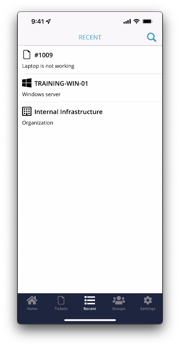 This tab functions similarly to the Recents menu on the left side of the NinjaOne console. From here, you will find the most recent devices and organizations that you have viewed during your current session on the NinjaOne mobile app. For more information, refer to
