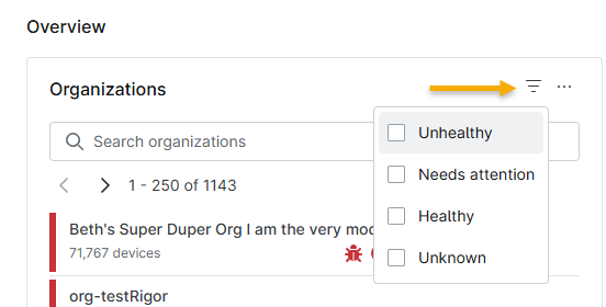 - Filter: Filter devices by the following health status levels: Unhealthy, Healthy, Needs attention, or Unknown.