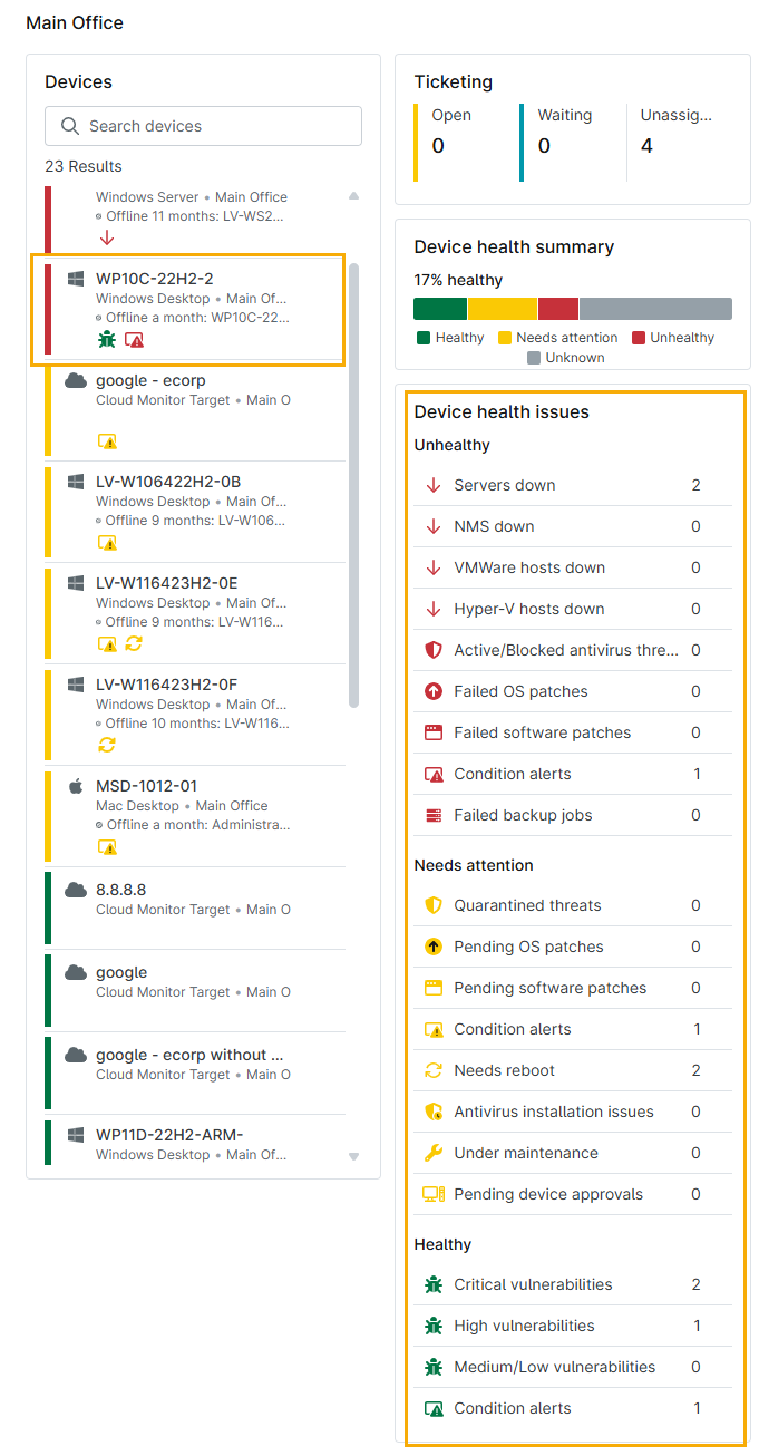 Items that need attention within your organization will appear as warning icons next to the organization name. Place your cursor over the icon to learn more about the issue. Click the organization name to display its specific device health issues.