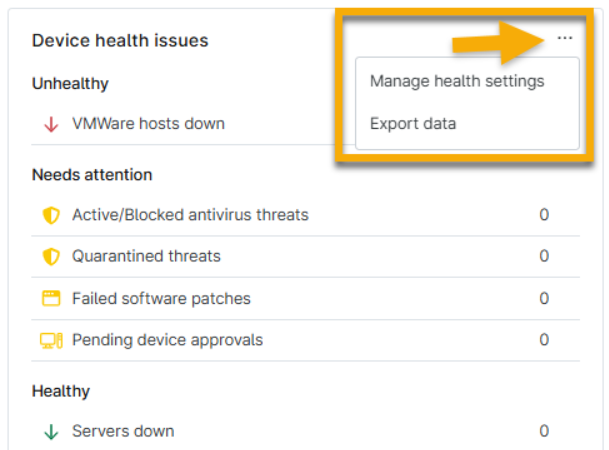 Place your cursor over the widget, then click the ellipsis (three dots) icon when it appears to manage health settings or export the data to a CSV file. Selecting Manage health settings will take you to Administration → Devices → Health status, where you can customize the status for each issue.