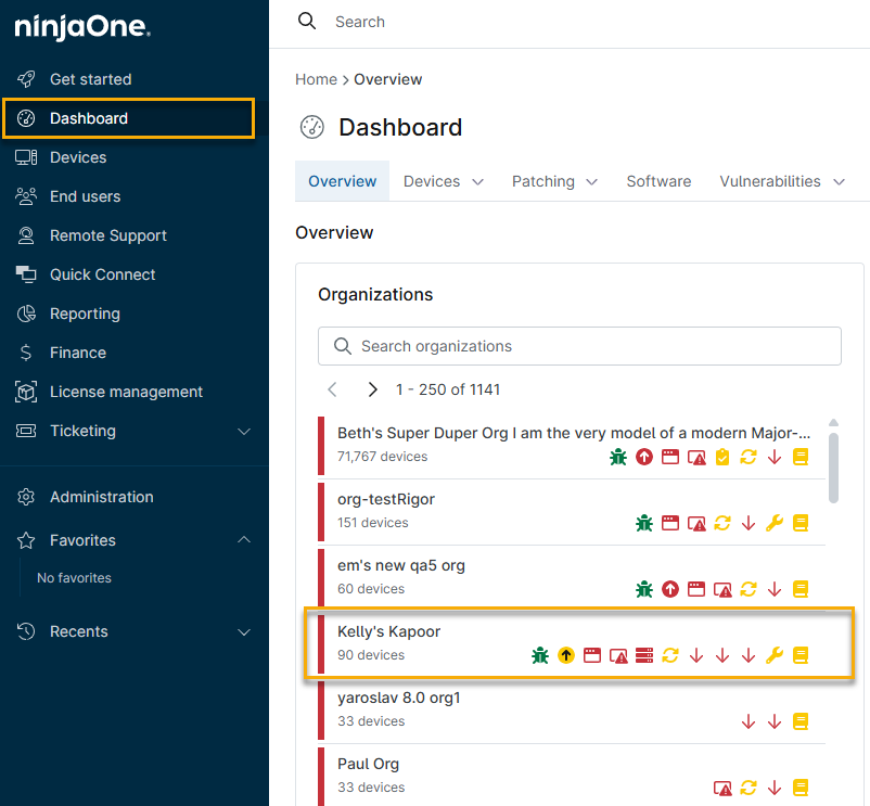 In the NinjaOne dashboard, click an organization to access its specific dashboard.