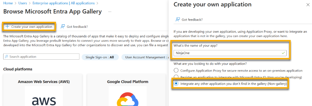 - Select the option to Integrate any other application you don't find in the gallery. Then, click Create.