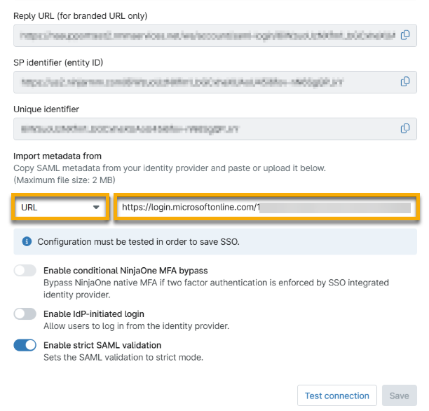 - Return to the IDP page in NinjaOne. Paste the App Federation Metadata URL data into the Import metadata from field as a URL.