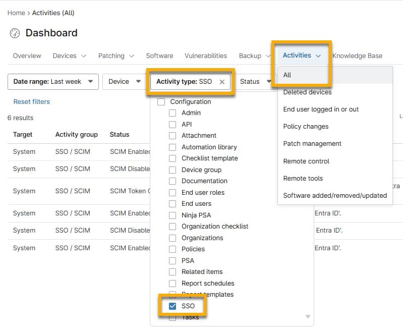 Figure 16: View all activities related to SSO and SCIM (click to enlarge)