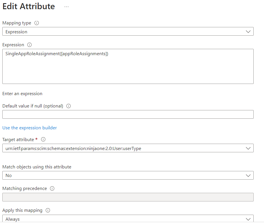- Target attribute: urn:ietf:params:scim:schemas:extension:ninjaone:2.0:User:userType