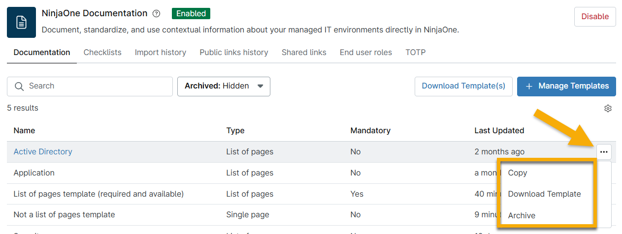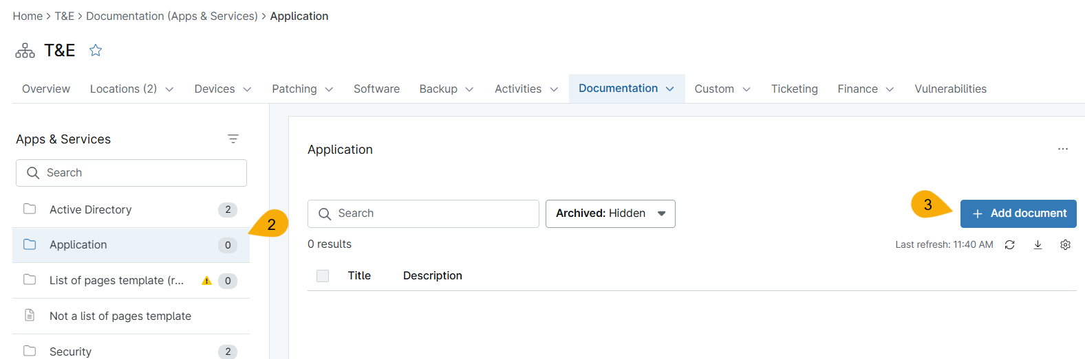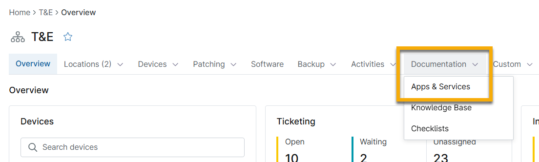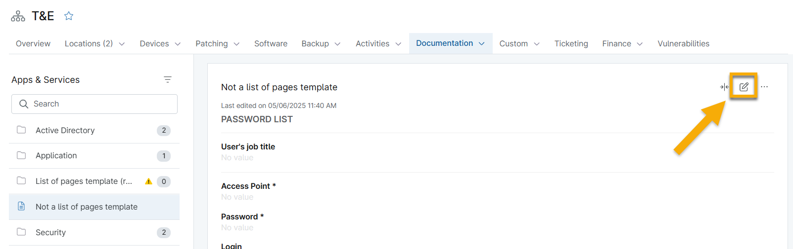 Use the Documentation → Apps & Services tab to manage your document templates. To learn about adding documentation via the WYSIWYG field or uploading files, refer to NinjaOne Documentation: Knowledge Base Feature.