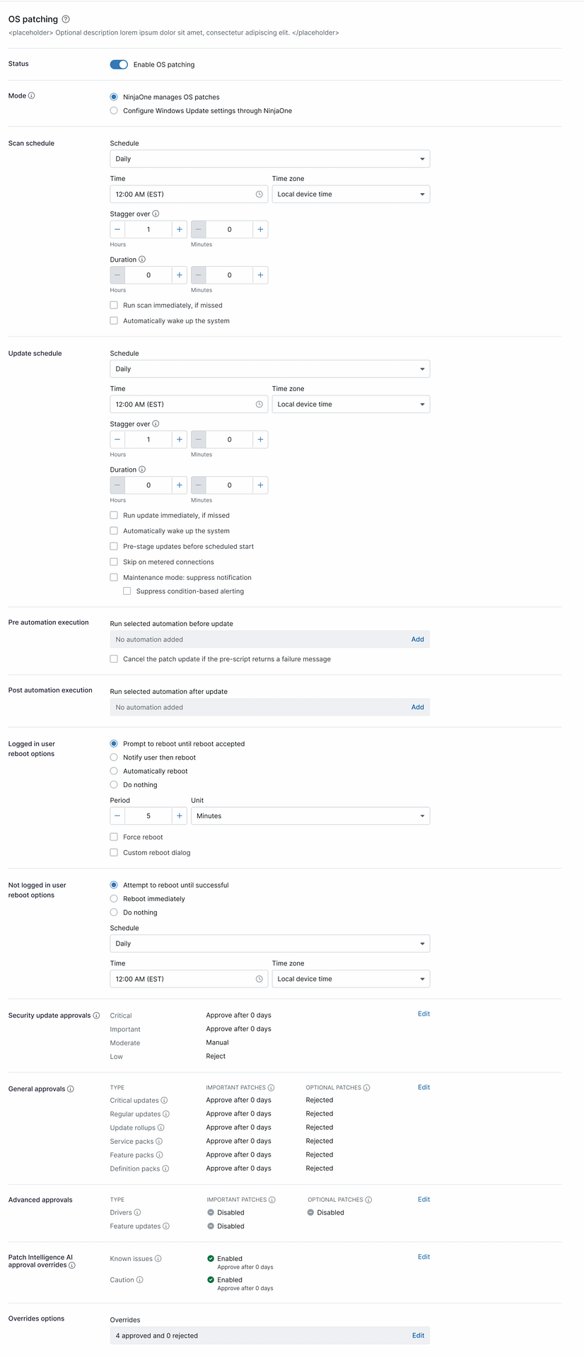 | Security update approvals | Configure approval settings for product-specific, security-related vulnerabilities. Microsoft categorizes security vulnerabilities in its security bulletin as Critical, Important, Moderate, or Low. We recommended applying Critical and Important fixes immediately. For Moderate fixes, we advise reading the related KB before patching. Click Edit to set NinjaOne to approve, reject, or require manual patch approval automatically. |