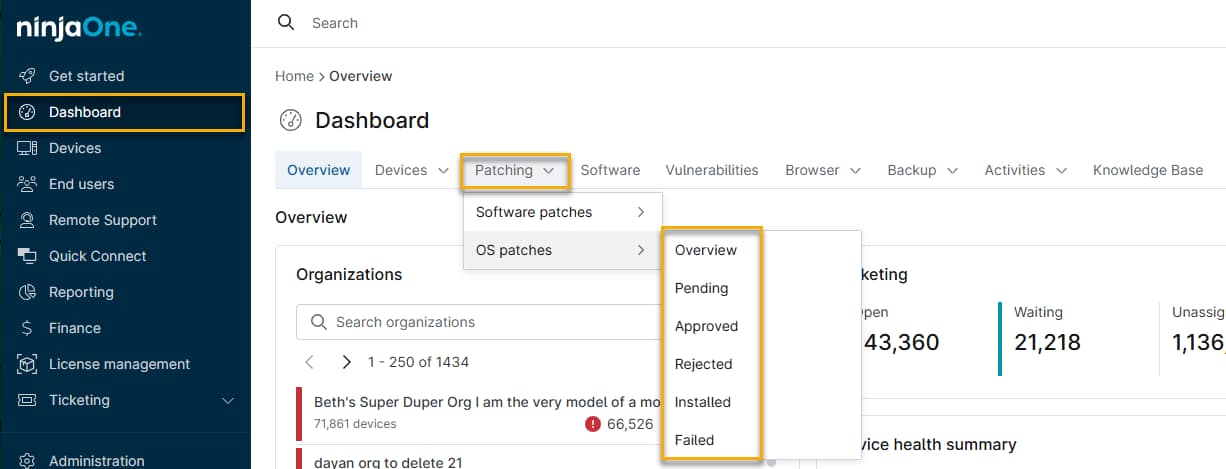 At the System or Organization dashboard level, you can click the number in the Devices column to generate a list of the devices to which the patch status applies. For example, clicking the number for a patch in the Approved tab shows the devices for which NinjaOne has approved it, but not yet installed it