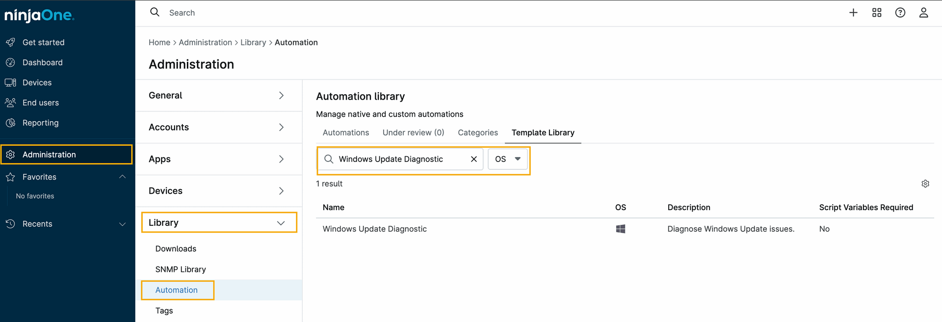 NinjaOne provides an automation in the Template Library. Navigate to Administration → Library → Automation and search for Windows Update Diagnostic.