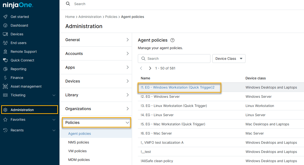 - In NinjaOne, navigate to Administration → Policies, then choose a Windows policy from the Agent policies list.