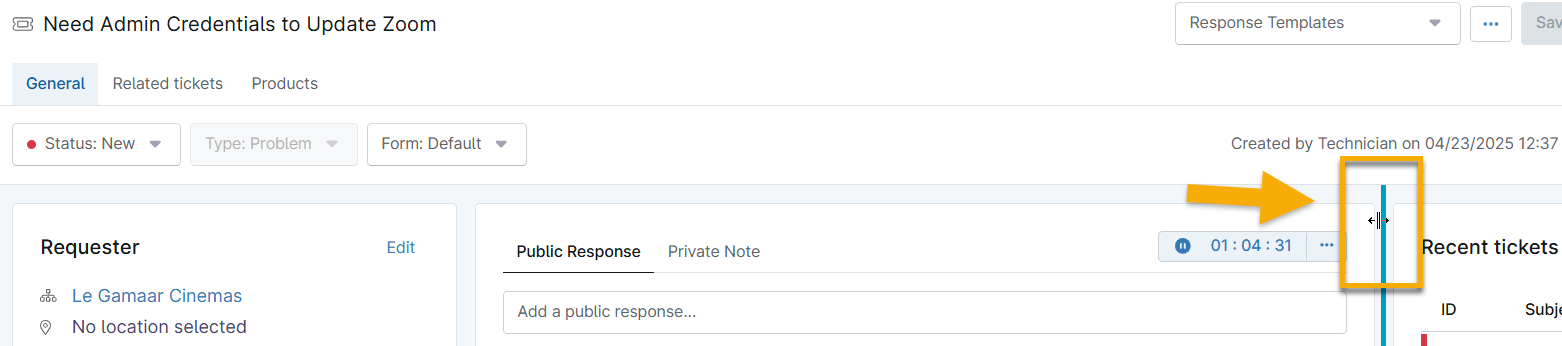 To change the width of the section, move your cursor between the response editor and the Recent tickets section until a blue vertical line appears. Click and drag the blue line to the left or right, according to your preference.