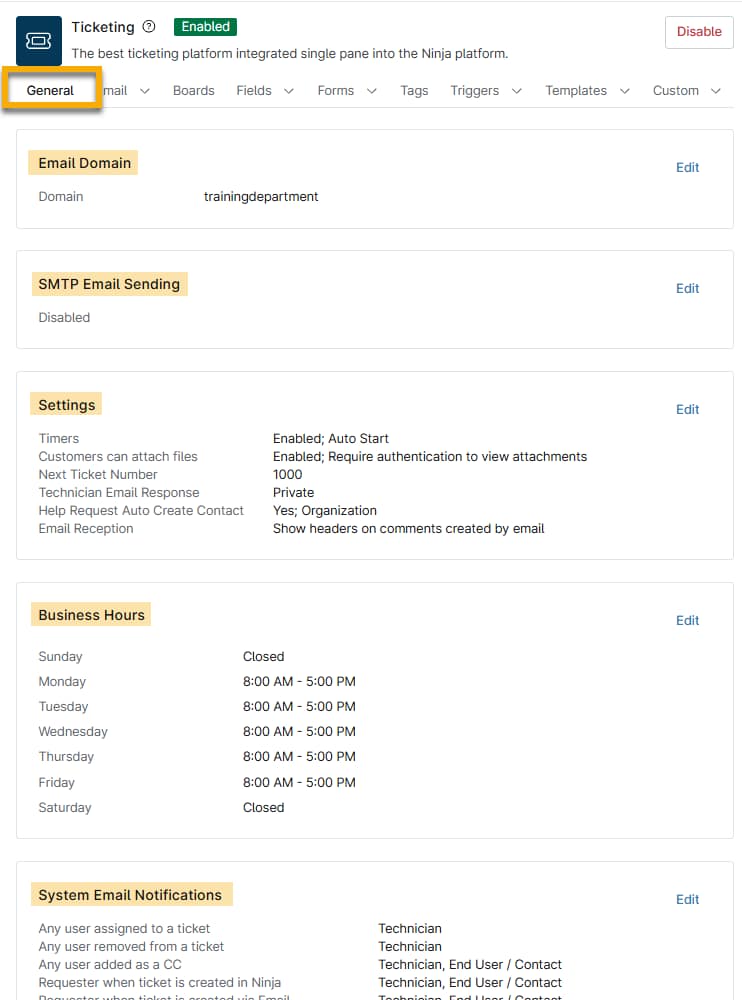 System administrators are prompted to configure these settings during the initial setup process for NinjaOne Ticketing. These settings can be updated at any time.