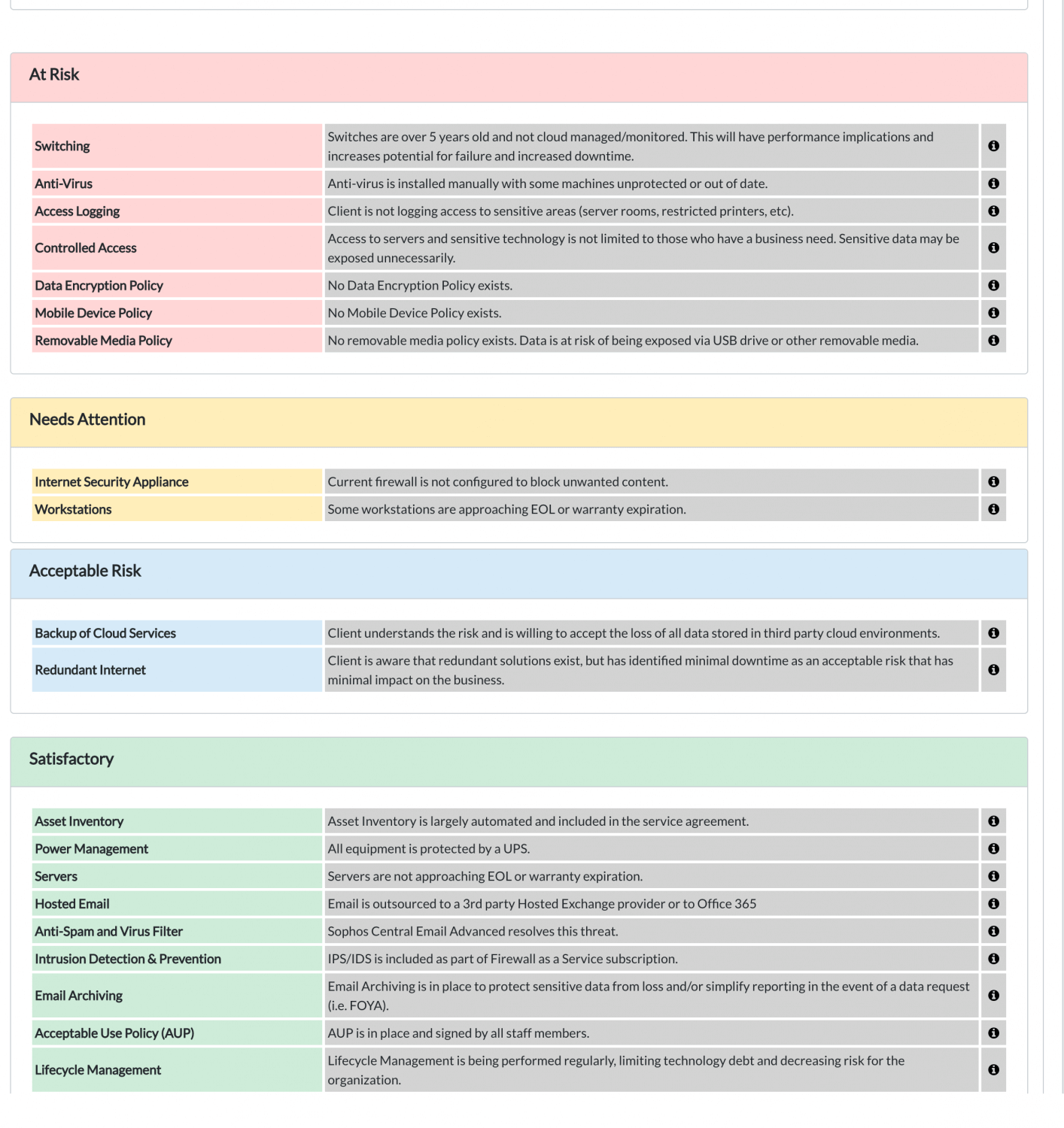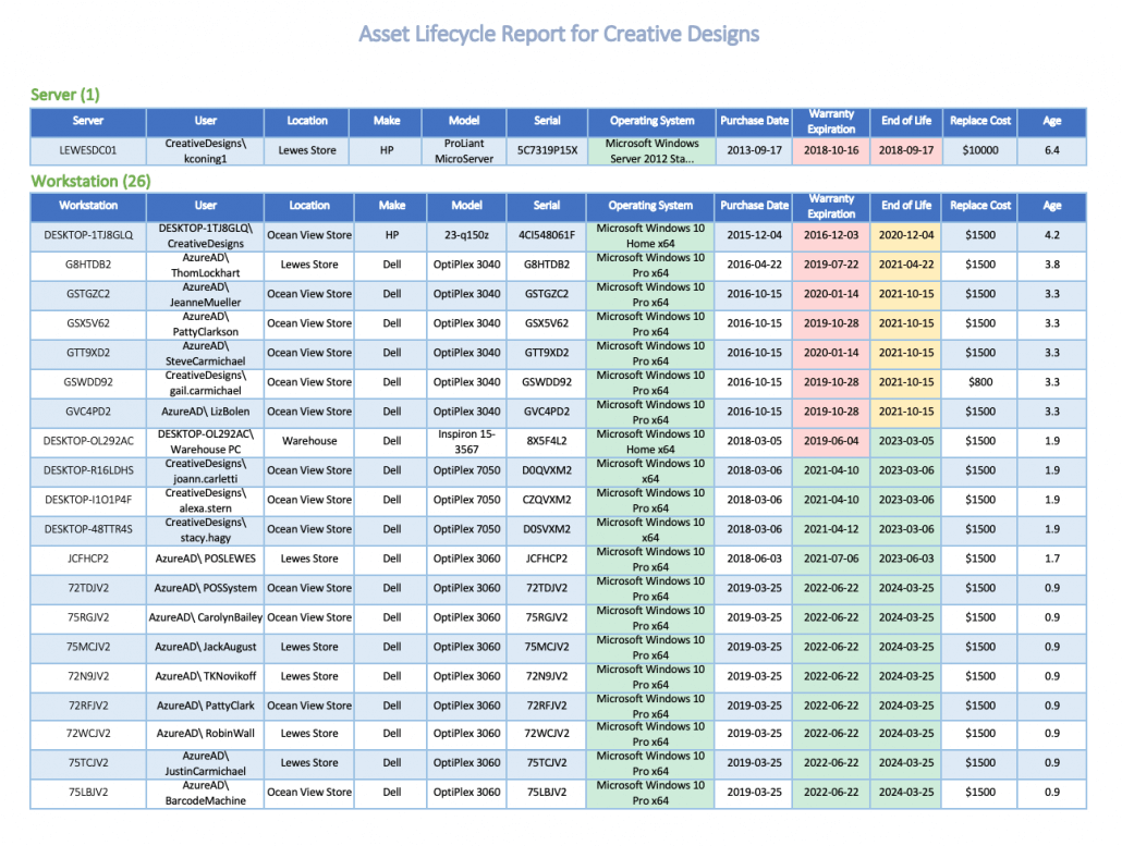 Tener una imagen clara de la gestión del ciclo de vida de los activos es fundamental. Disponer de un informe codificado por colores que muestre qué dispositivos están al final o cerca del final de su vida útil es una herramienta de venta sencilla, ya que no es necesario hablar de temas demasiado técnicos. El informe muestra claramente que es necesario sustituir los dispositivos rojos. A partir de ahí, la conversación con el cliente se centra simplemente en cuándo pueden presupuestarlo.