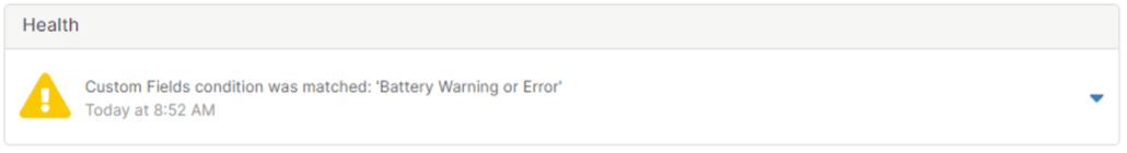 El script de definición de estado de la batería ahora extraerá datos de todos los endpoints gestionados por esta política cada hora y los escribirá en el campo personalizado. Si el valor de retorno en cualquiera de esos endpoints contiene «advertencia» o «degradado», recibiremos una alerta para que podamos remediarlo.