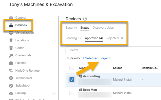 Rechazar dispositivos y restringir su registro en NinjaOne